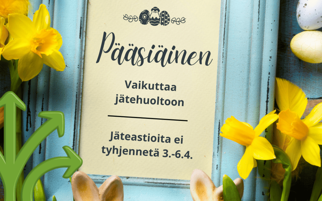 Jäteastioita ei tyhjennetä 3.-6.4. välisenä aikana. Siitä syystä jäteastioita saatetaan tyhjentää normaalista poikkeavina päivinä – joko etu- tai jälkikäteen – niin pääsiäistä edeltävällä, kuin pääsiäistä seuraavallakin viikolla.